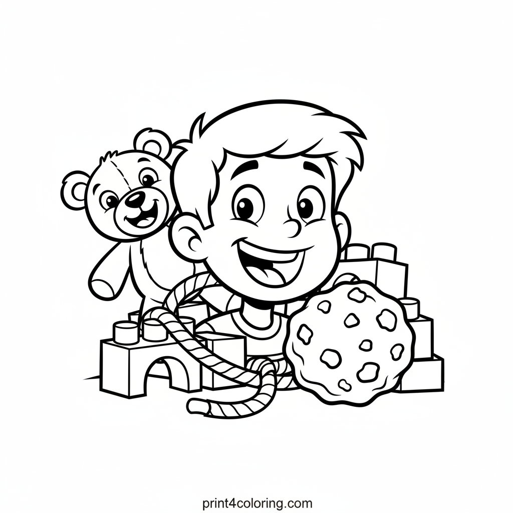 Join Fred as he sets up his hilarious 'snack trap'! Watch his big, playful grin as he carefully arranges colorful blocks and soft ropes to catch a hungry toy monster with a giant, delicious cookie. A super cute teddy bear giggles nearby, excited for the fun. Get ready to add bright colors to this silly, snack-time adventure!