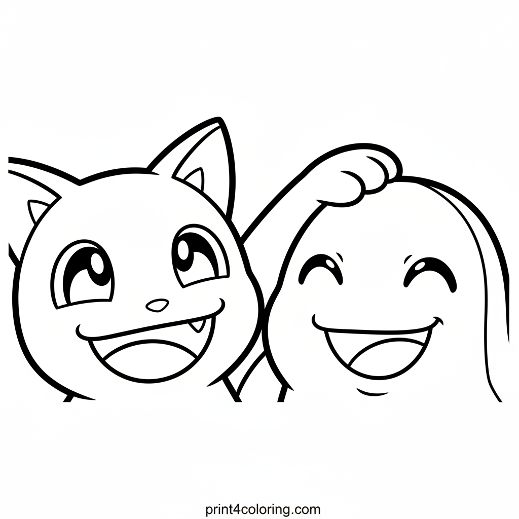 Get ready to color a heartwarming scene with two beloved Pokémon! Meowth is sharing a gentle, friendly pat on Wobbuffet's head, and both are beaming with happiness. Their big, friendly eyes show just how much they enjoy each other's company. This wholesome close-up portrait is perfect for young artists to bring to life with bright and cheerful colors.