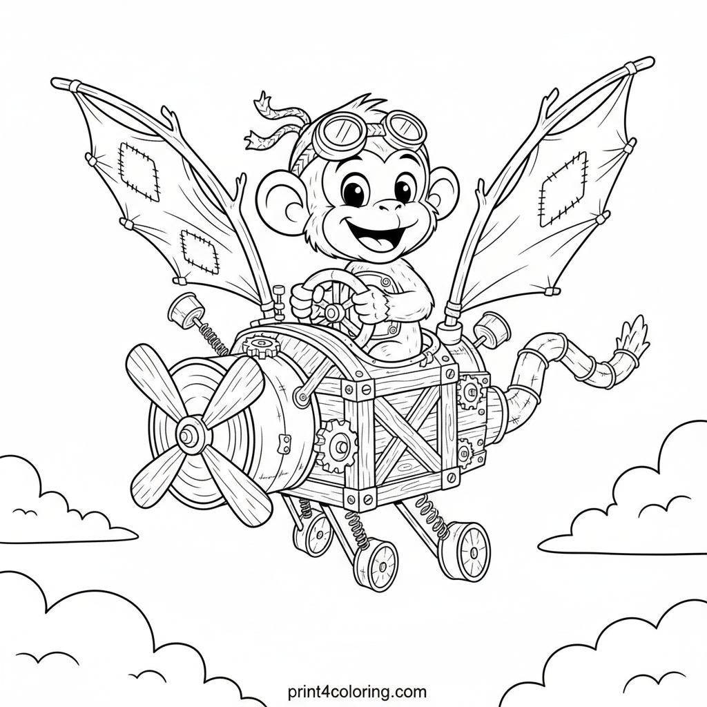 Join a brilliant monkey inventor as it takes to the skies in its incredible, self-made flying machine! Crafted from recycled bits and bobs, this whimsical contraption soars above fluffy clouds. Watch its joyful grin as it pilots its amazing invention on an exciting airborne adventure. A delightful scene for imaginative coloring!