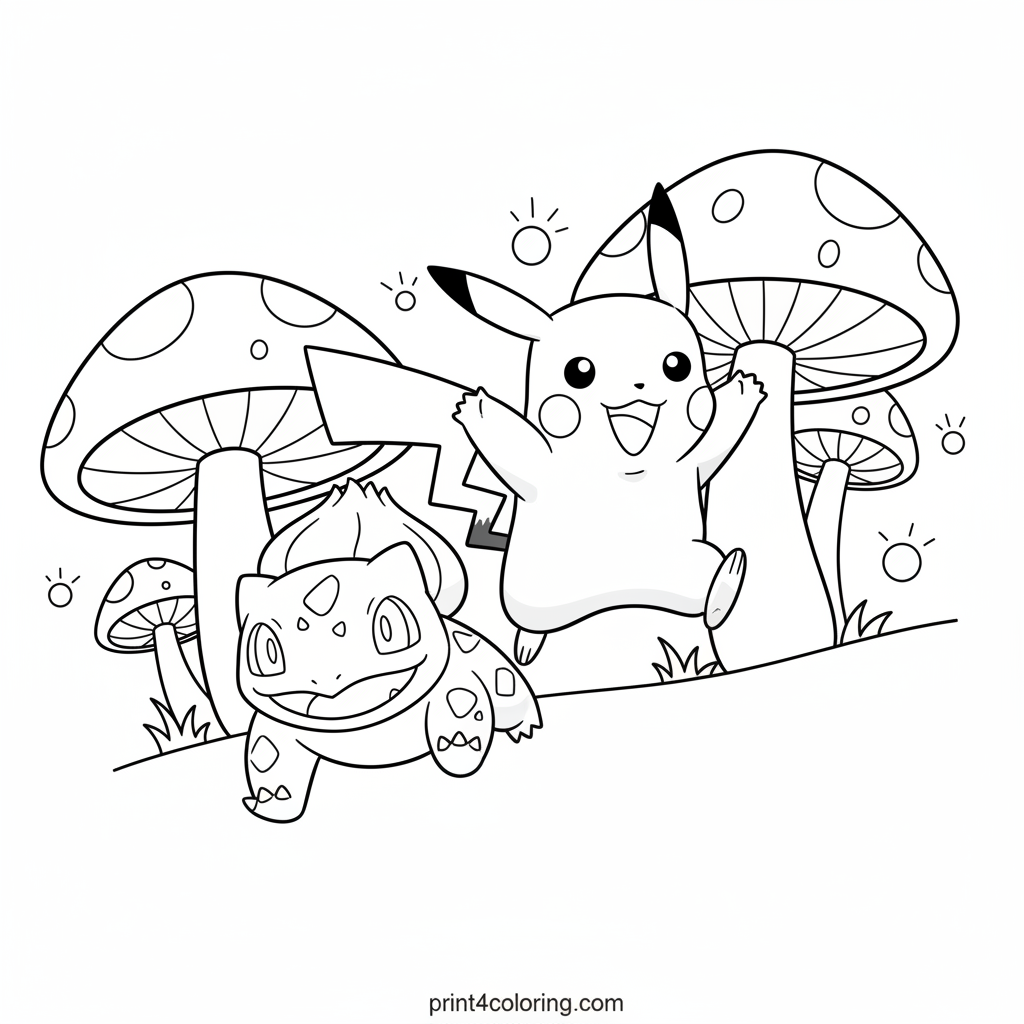 Pikachu and Bulbasaur's Enchanted Mushroom Forest Coloring Page