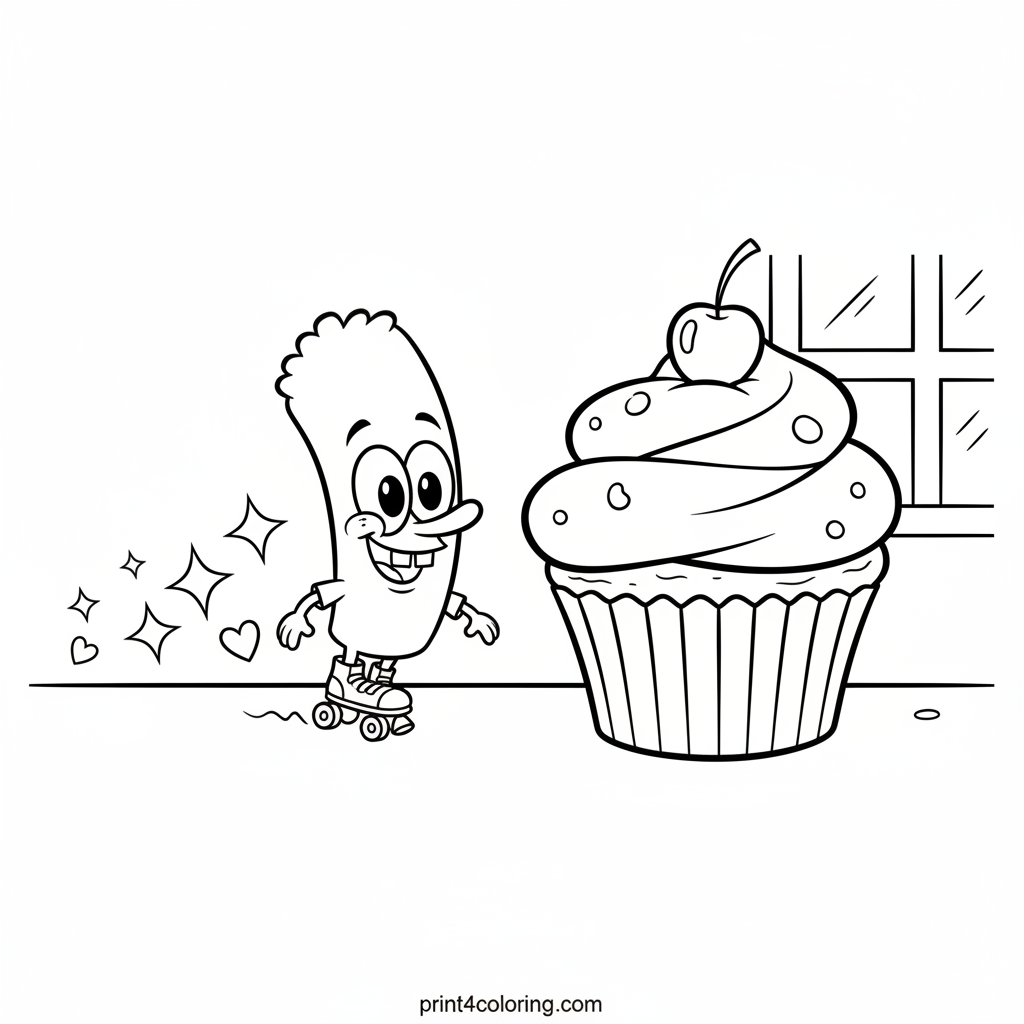 Watch out, world! Plankton is on a mission! Zoom along with him on his tiny roller skate as he races towards a giant, yummy cupcake. Follow the trail of happy sparkles he leaves behind in this super fun scene. Get ready to add vibrant colors to his speedy snack adventure!