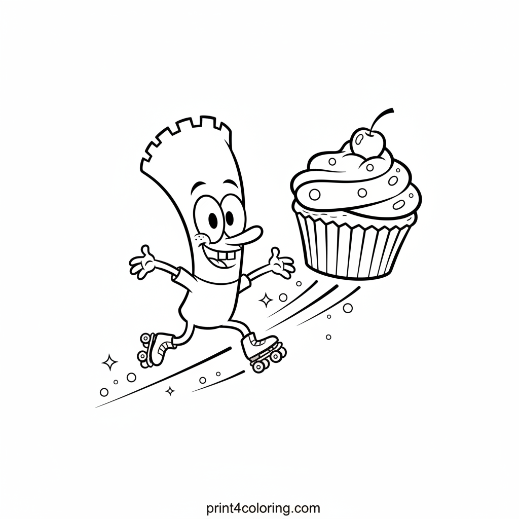 Join Plankton on an epic journey as he zips and zooms on his tiny roller skate! Watch him race with joy towards a colossal cupcake, leaving a trail of happy sparkles behind. This fun scene is perfect for little artists to bring to life with bright colors. Imagine the sweet taste of victory as Plankton reaches his delicious dessert!
