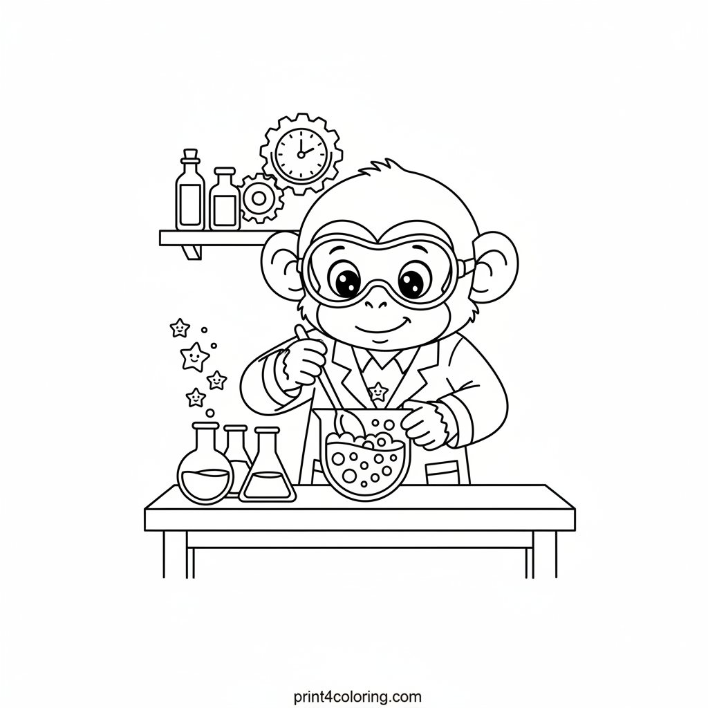Join Professor Monkey in his fantastical laboratory as he concocts a marvelous, sweet experiment! Watch his kind eyes sparkle behind his goggles as he stirs a beaker filled with a vibrant, bubbly potion, creating tiny floating stars. This delightful scene invites you to add your brightest colors to his magical scientific adventure!
