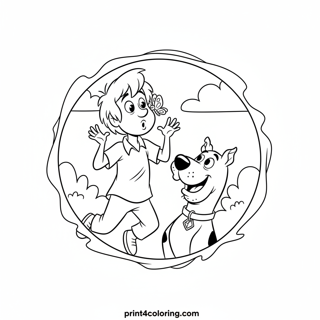 Join Shaggy and Scooby for a giggle-filled moment! Shaggy gets a comical surprise when a tiny, friendly butterfly lands right on his nose, making him jump with wide, silly eyes. Scooby watches his pal's funny reaction, chuckling playfully. Grab your crayons and add vibrant colors to this cozy, heartwarming scene!