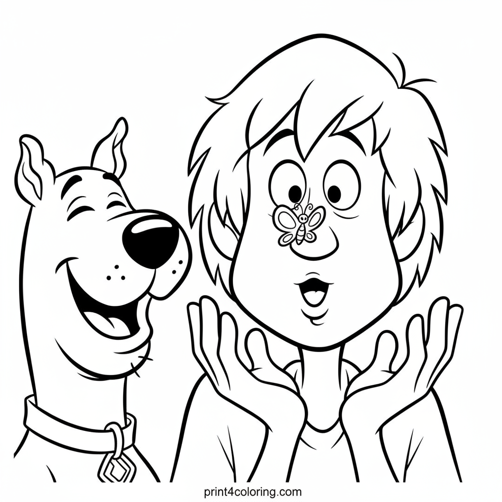 Get ready for a giggle with Shaggy and Scooby-Doo! Shaggy is comically startled, eyes wide and hands up, by a tiny, friendly butterfly on his nose. His best pal Scooby is right there, playfully giggling at the silly surprise. Bring this funny moment to life with your favorite colors!