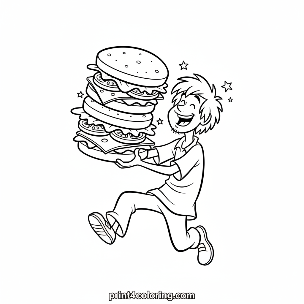 Join Shaggy from Scooby-Doo as he beams with joy, proudly holding his towering, wobbly sandwich! This hilarious creation is packed with all sorts of yummy ingredients, so many that little stars are swirling around his head. Get ready to add vibrant colors to Shaggy's big smile and his amazing, super-stacked snack!