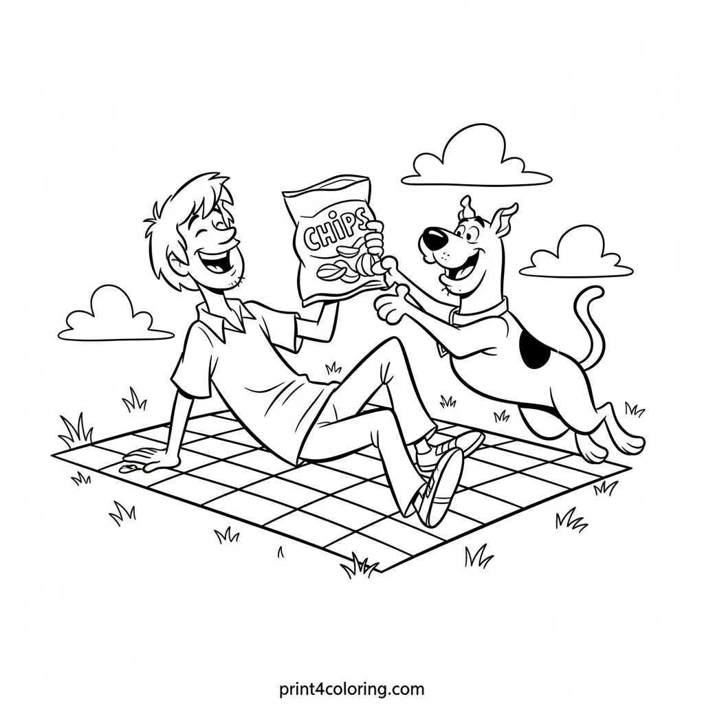 Get ready for snack time fun with Shaggy and Scooby-Doo! Shaggy is happily munching chips on a picnic blanket, while mischievous Scooby tries to snatch a tasty chip. Color this hilarious scene of friendship, laughter, and playful antics. A perfect page for fans!