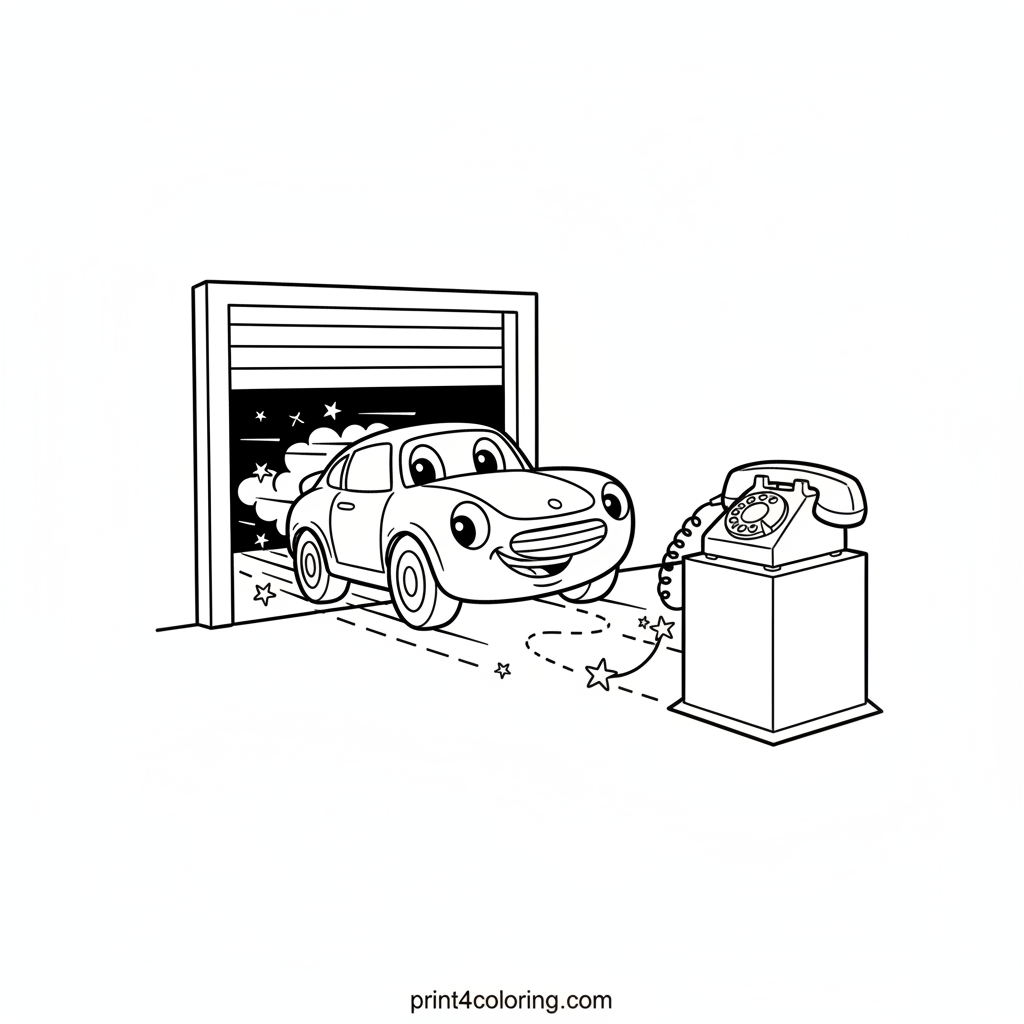 Get ready for an exciting rescue! Our super-fast, friendly car with big, cheerful eyes is zooming out of the garage, leaving a dazzling trail of stars behind. A glowing red hotline phone signals a new call for help. Grab your crayons and bring this heroic moment to life!