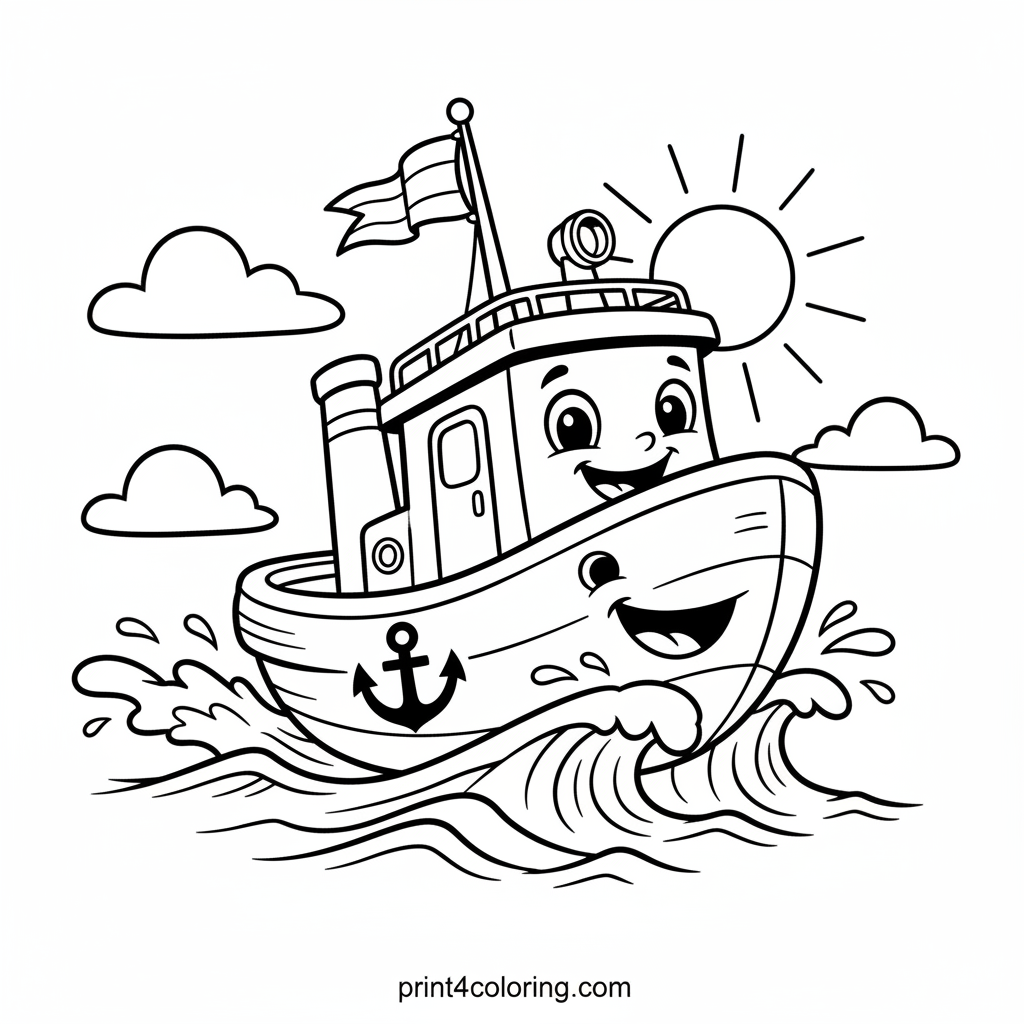 Get ready for a thrilling ocean adventure with our cheerful tugboat! Watch as this smiling vessel, with a bold anchor symbol, zips across gentle waves, its little flag waving in the wind. Imagine the exciting race and bring this speedy ship to life with your favorite colors!