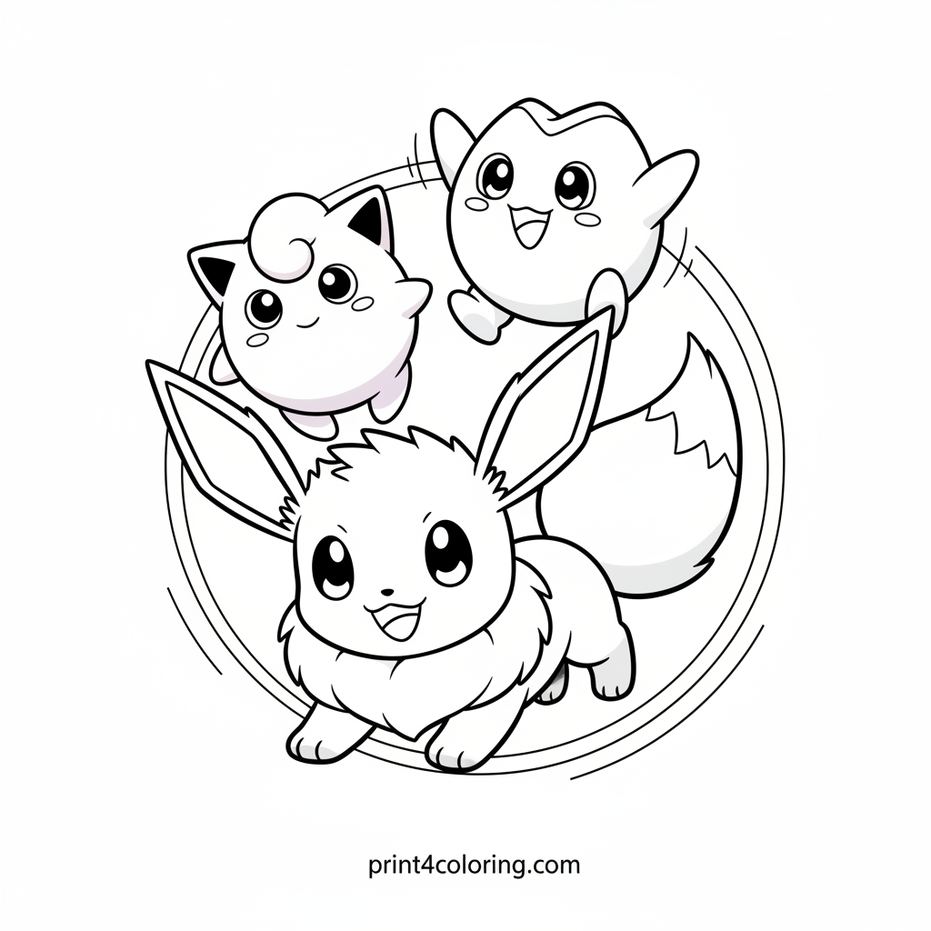 Join Eevee, Togepi, and Jigglypuff for a joyful adventure! Eevee pounces with glee, Togepi bounces high, and Jigglypuff floats serenely on a sunny day. This delightful scene is perfect for little artists to bring to life with their favorite colors, celebrating friendship and outdoor fun with these adorable Pokémon pals.