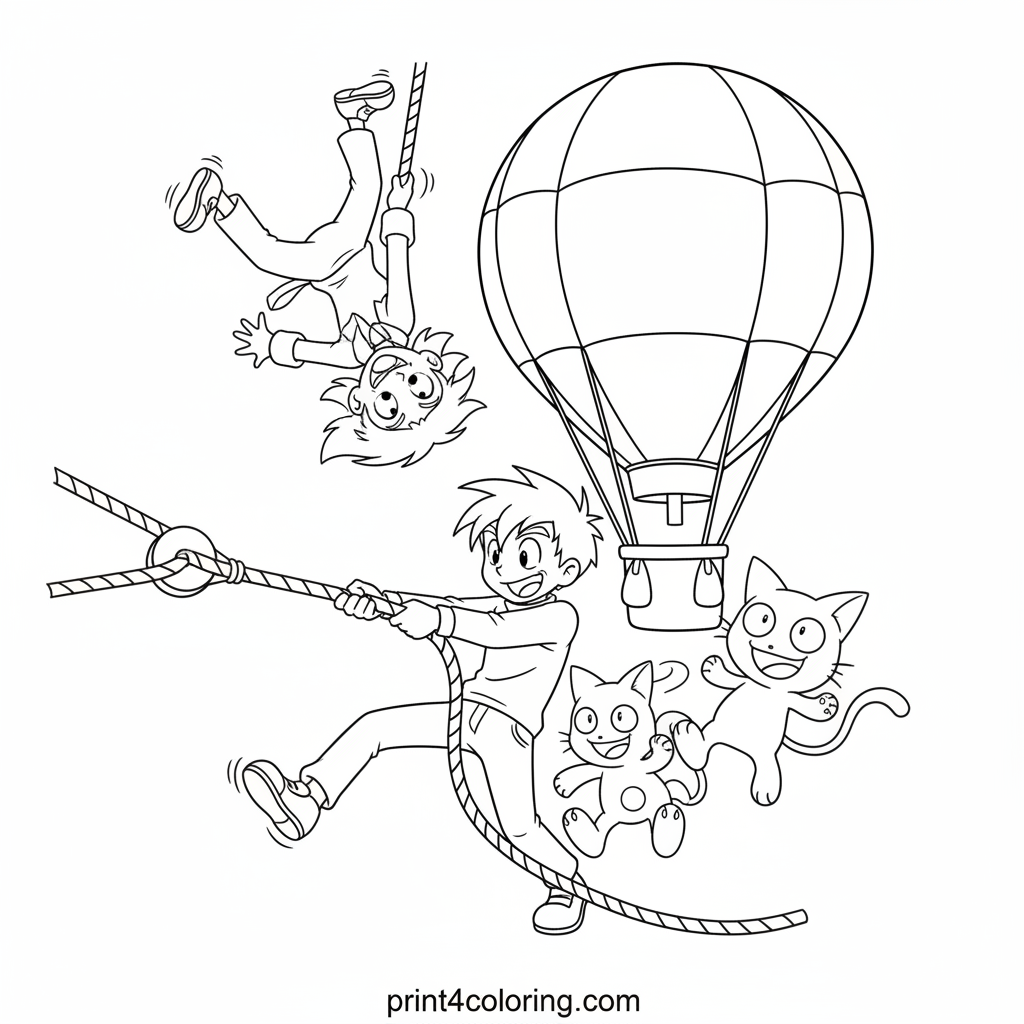 Jessie and James are hilariously tangled in ropes and pulleys, comically trying to launch their hot air balloon! Meowth and Wobbuffet watch with big, amused smiles. This action-packed scene is perfect for bringing Team Rocket's latest, silly adventure to life with your favorite colors.