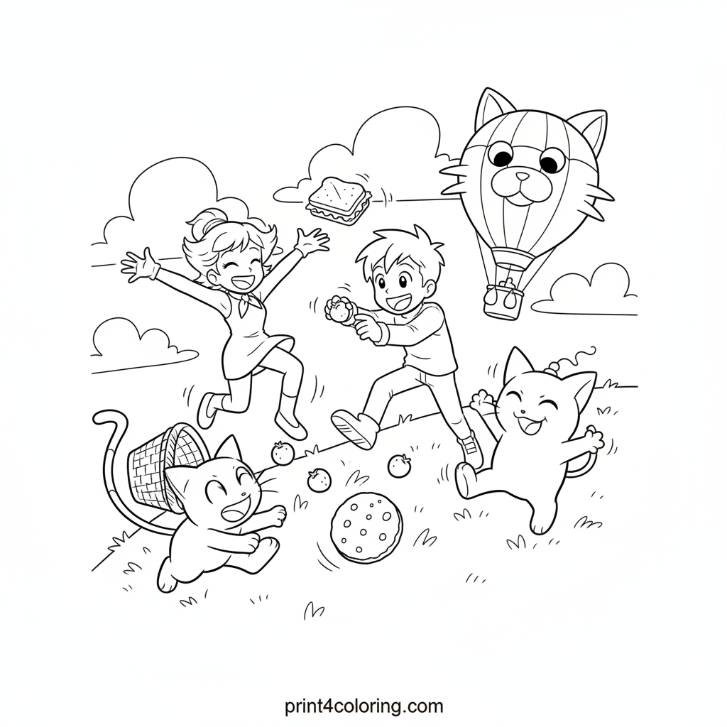 Witness a rare moment of peace with Jessie, James, Meowth, and Wobbuffet! This coloring page shows Team Rocket enjoying a delightful picnic on a sunny grassy hill, sharing yummy snacks and laughing. Their iconic hot air balloon rests gently nearby. A perfect scene for colorful creativity and imagination!
