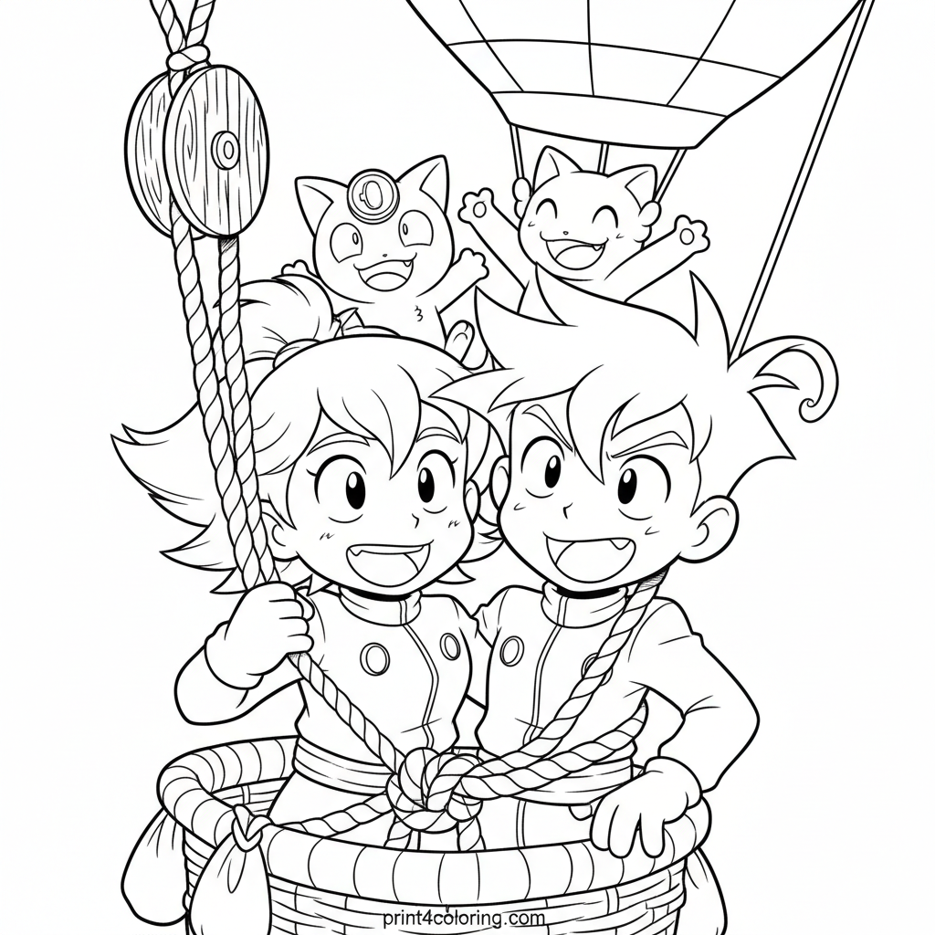 Join Jessie and James in a close-up, comical scene as they hilariously wrestle with a tangle of colorful ropes and pulleys, trying to launch their hot air balloon! Meowth and Wobbuffet watch their silly struggle with big, amused smiles, adding to the fun. Get ready to color this wacky adventure!