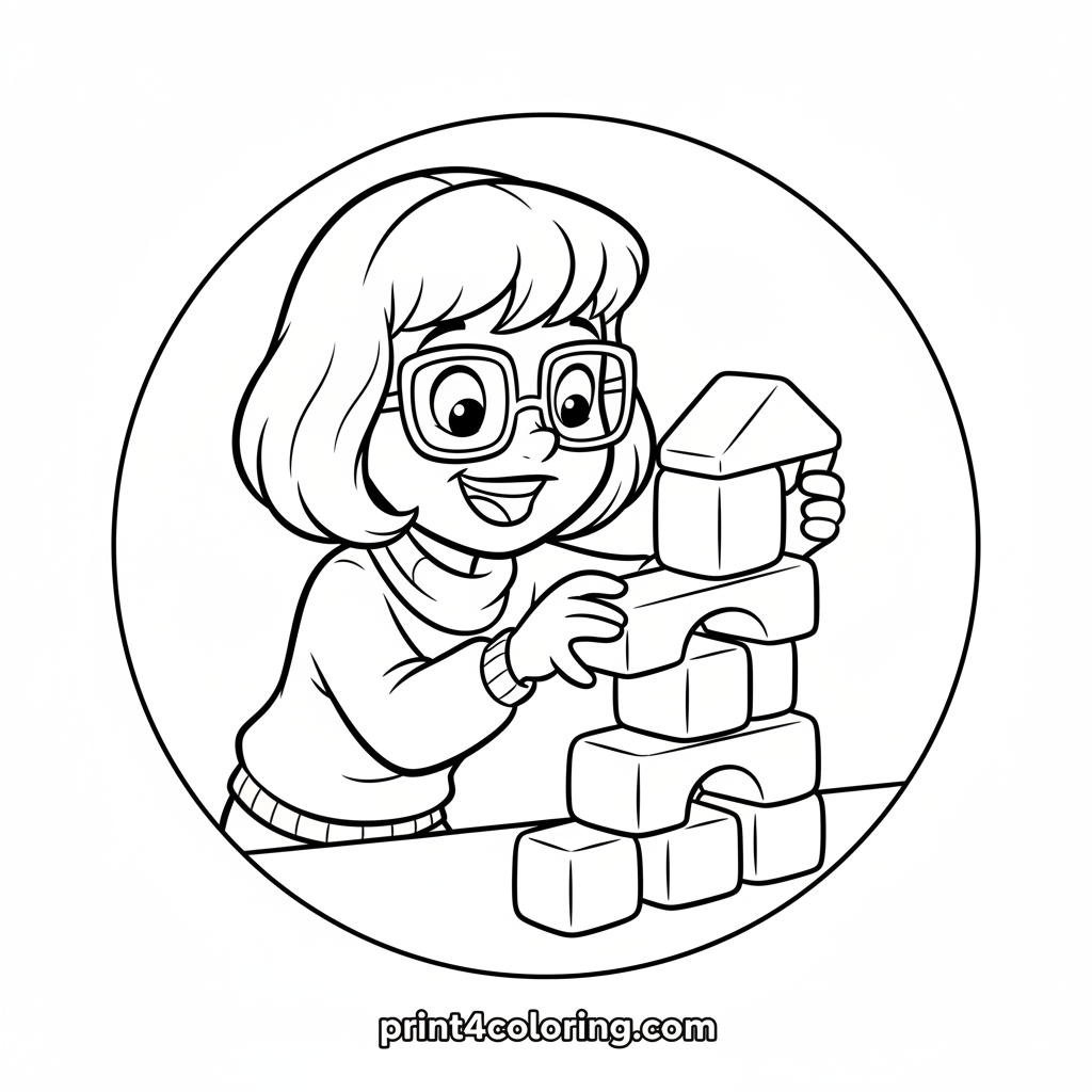 Join Velma as she takes on a fun stacking challenge! With her iconic glasses slightly askew, she's playfully concentrating on building a tall, colorful tower of oversized blocks. Use your brightest colors to help her keep it steady and vibrant. A cozy scene for creative little hands!
