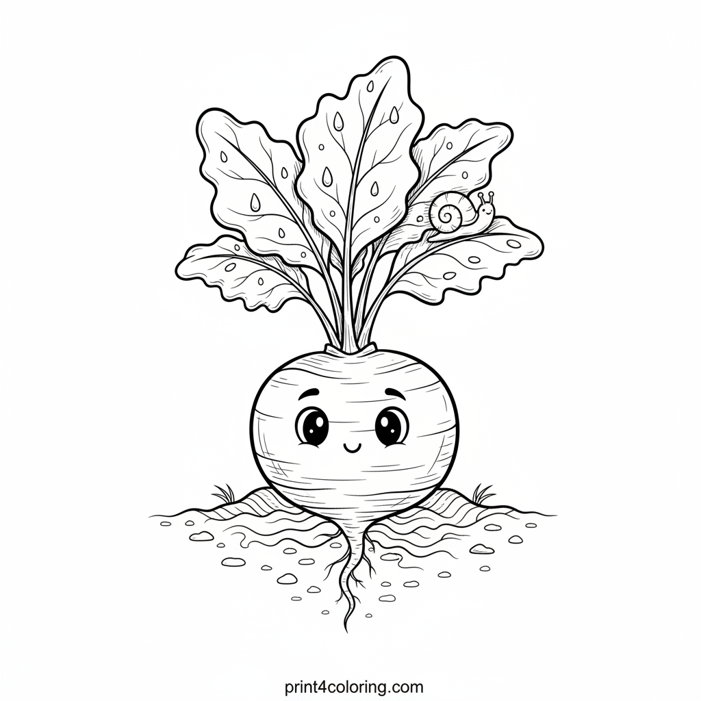 Discover a plump beet root nestled in its cozy garden bed. Its vibrant green leaves catch raindrops, while strong roots reach into the textured soil. Look closely for the tiny snail slowly making its way across a leaf. A charming, detailed scene for expert colorists!