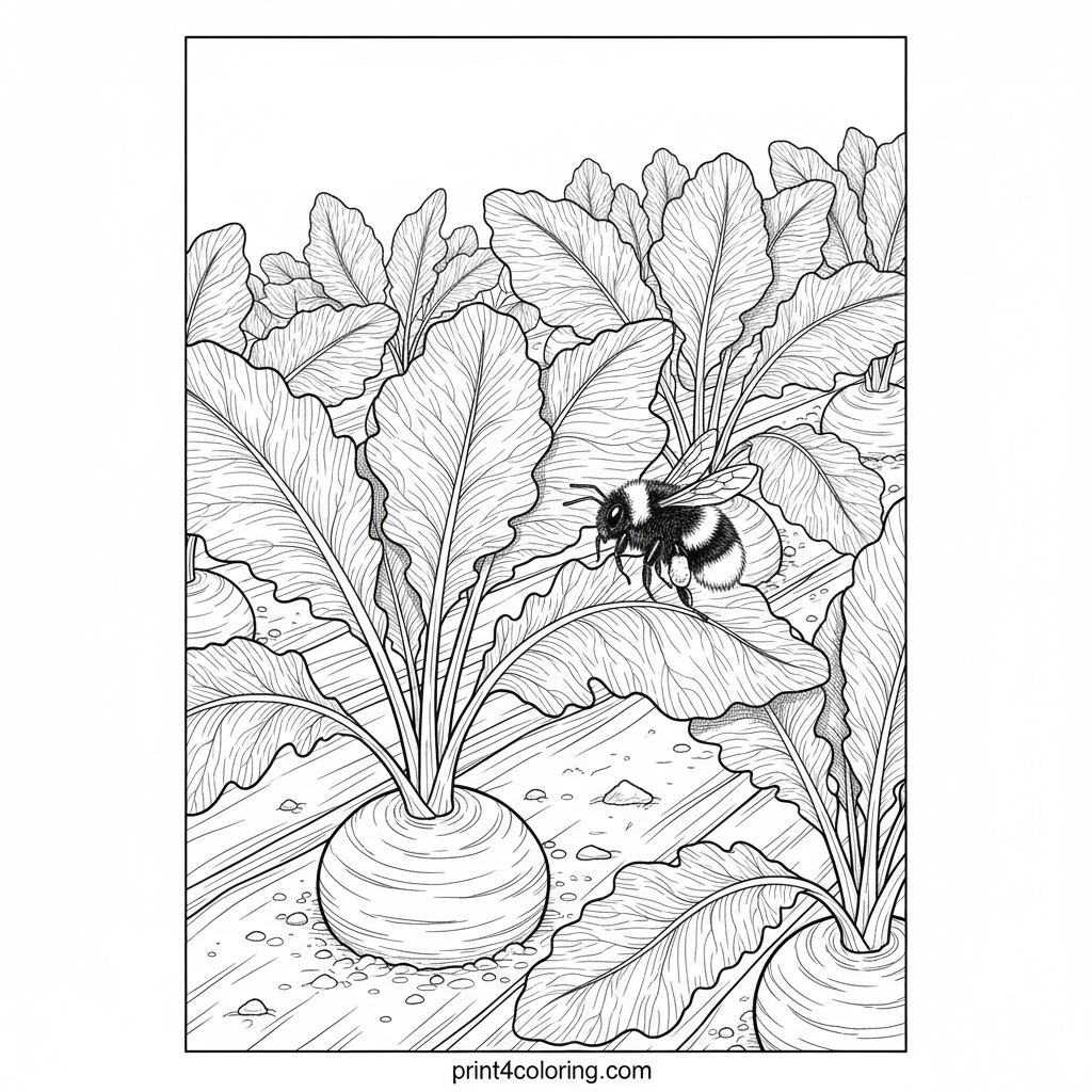 Explore a sunny garden scene where vibrant turnip plants thrive with their broad, textured leaves. Watch closely as a fluffy bumblebee gently lands, buzzing with purpose to gather nectar and pollen. This detailed page invites you to bring the garden's lively energy to life with your favorite colors!
