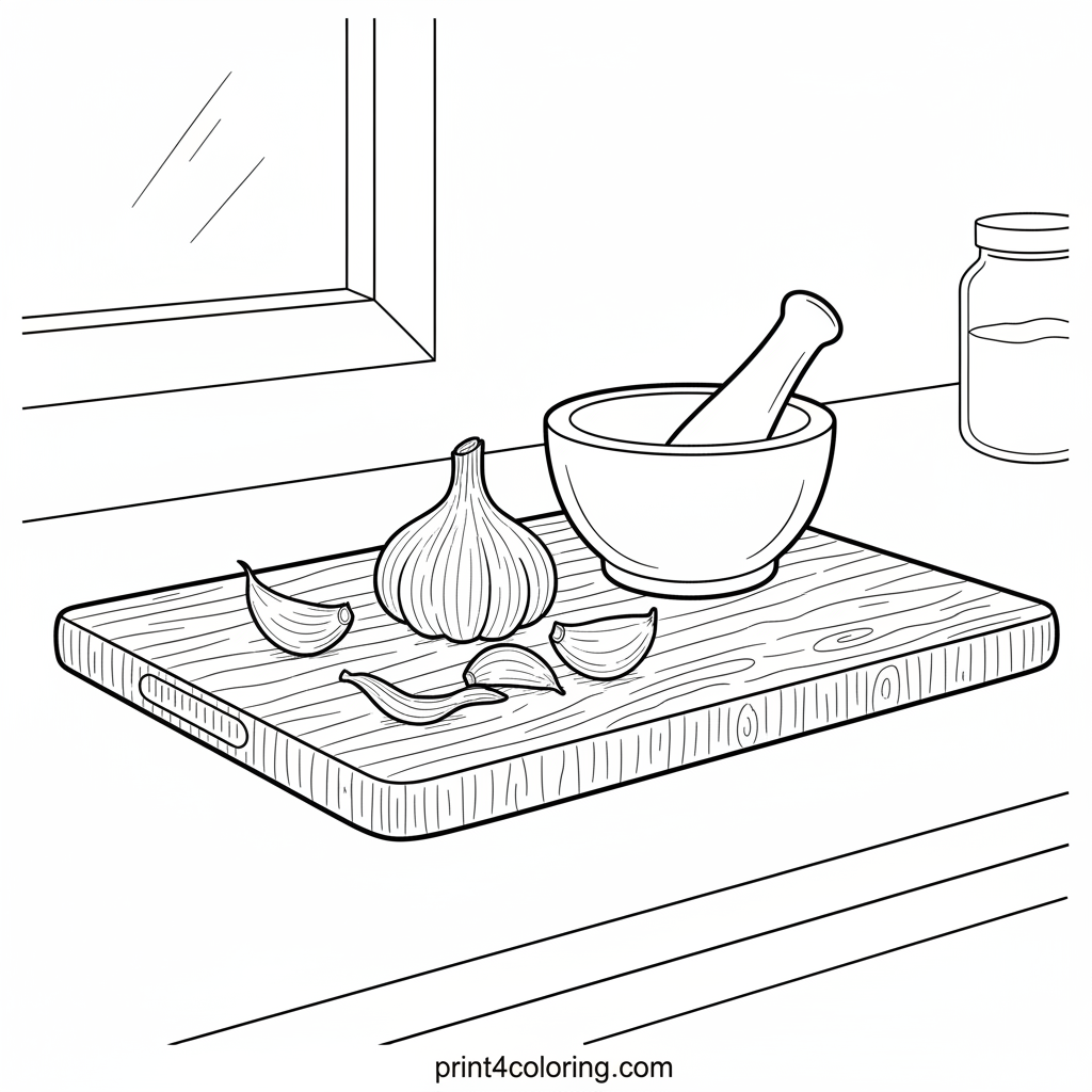 #garlic#kitchen#still-life#food#cooking#mortar-and-pestle#cutting-board#realistic#coloring-page#printable