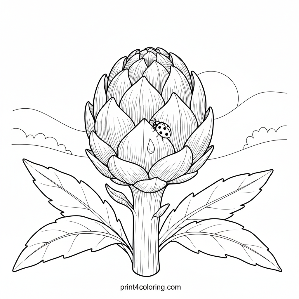 Dive into a detailed botanical scene featuring a young, unopened artichoke bud, its many layered leaves beautifully rendered. A tiny, friendly ladybug embarks on an adventure across a smooth outer leaf, perhaps heading for a sparkling dewdrop nearby. Perfect for expert colorists who love nature's intricate details!