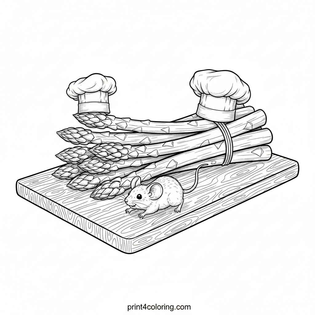Imagine a delightful bundle of fresh asparagus spears, standing tall like tiny chefs on a rustic cutting board! Two spears wear whimsical chef hats, while a friendly little kitchen mouse peeks out, curious about the culinary fun. Explore rich textures and tiny details in this charming kitchen scene.