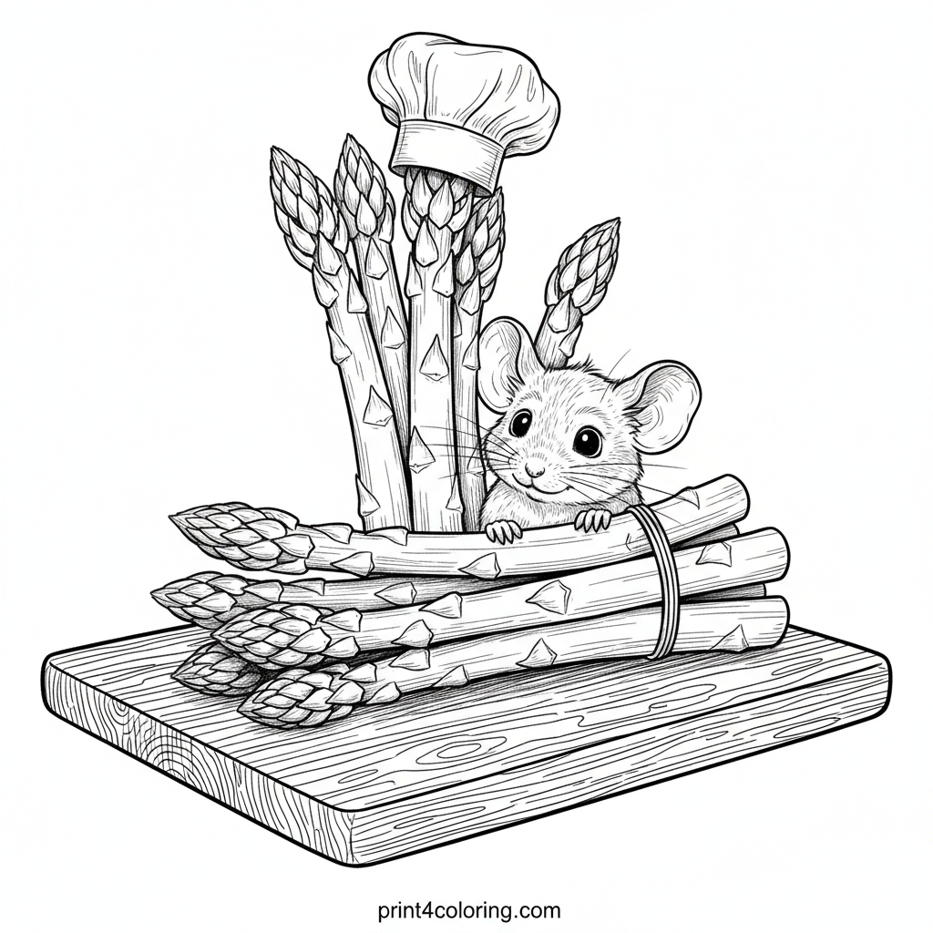 Dive into a delicious scene! Color a bundle of fresh asparagus, some wearing tiny chef hats. A friendly kitchen mouse peeks out, adding a touch of whimsy to this rustic cutting board still life. Explore textures and intricate details in this gourmet garden delight!