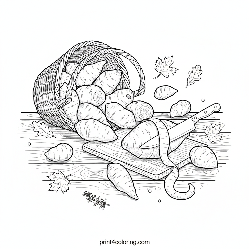Explore the cozy warmth of autumn with this detailed kitchen still life. A rustic basket overflows with freshly harvested yams, resting on a wooden counter. A chef's knife and cutting board are nearby, with one yam partially peeled. Add vibrant colors to the yams, wood, and subtle fallen leaves.