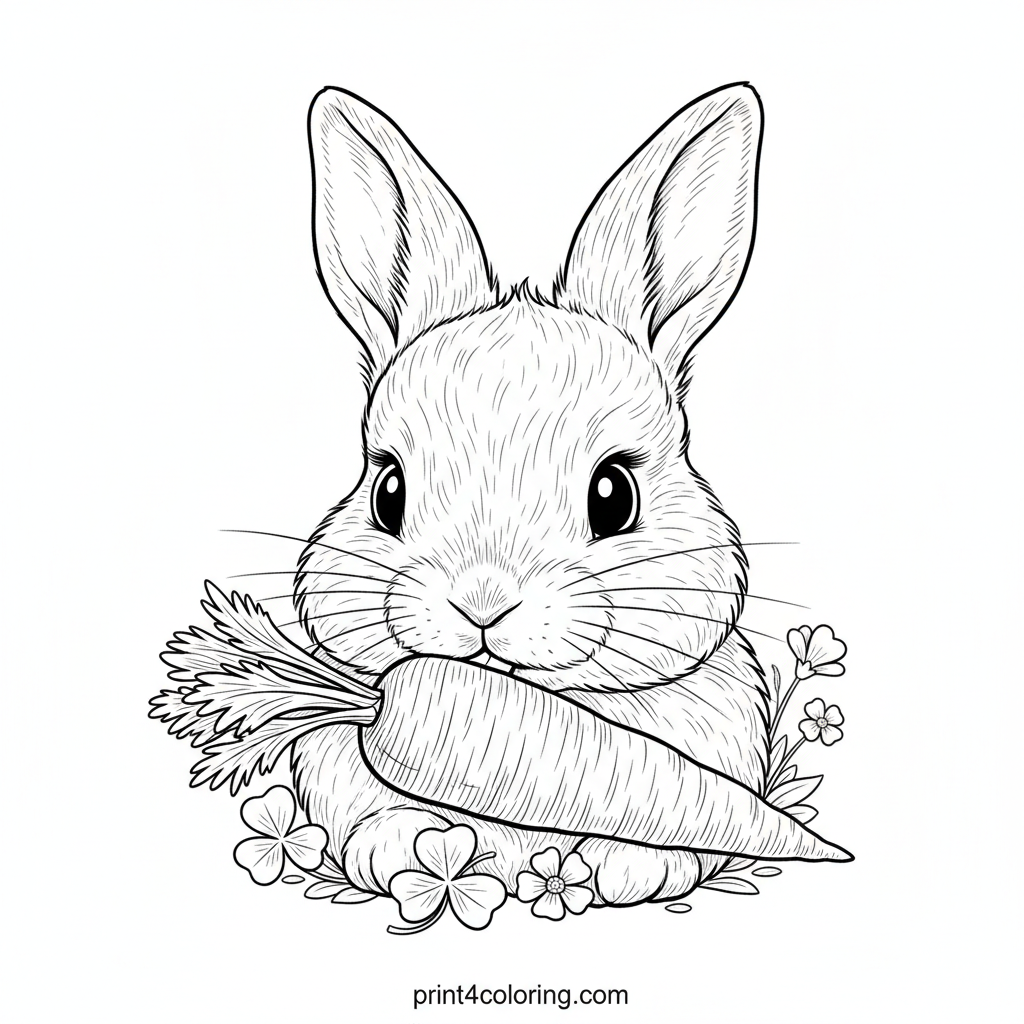 Meet an adorable baby bunny with big, curious eyes, experiencing the joy of its very first carrot! This close-up portrait captures the fluffy little friend gently nibbling a crisp, fresh carrot amidst a detailed field of clover and tiny wildflowers. A delightful scene for expert colorists to bring to life!