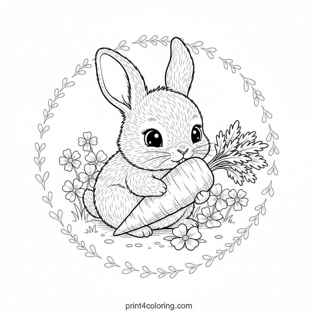 Meet a fluffy baby bunny, full of wonder, as it enjoys its very first crisp carrot! This adorable scene captures tiny paws, big curious eyes, and a detailed field of clover and wildflowers. Imagine the soft fur and the vibrant greens and oranges as you bring this heartwarming moment to life with your colors.