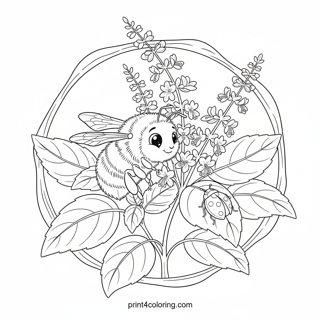 Dive into a delightful garden scene! This expert coloring page features a busy bumblebee gently gathering nectar from a vibrant basil blossom. Explore the intricate details of textured basil leaves, delicate flowers, and spot a tiny ladybug on a nearby leaf. A cozy close-up of nature's tiny wonders, perfect for detailed coloring.