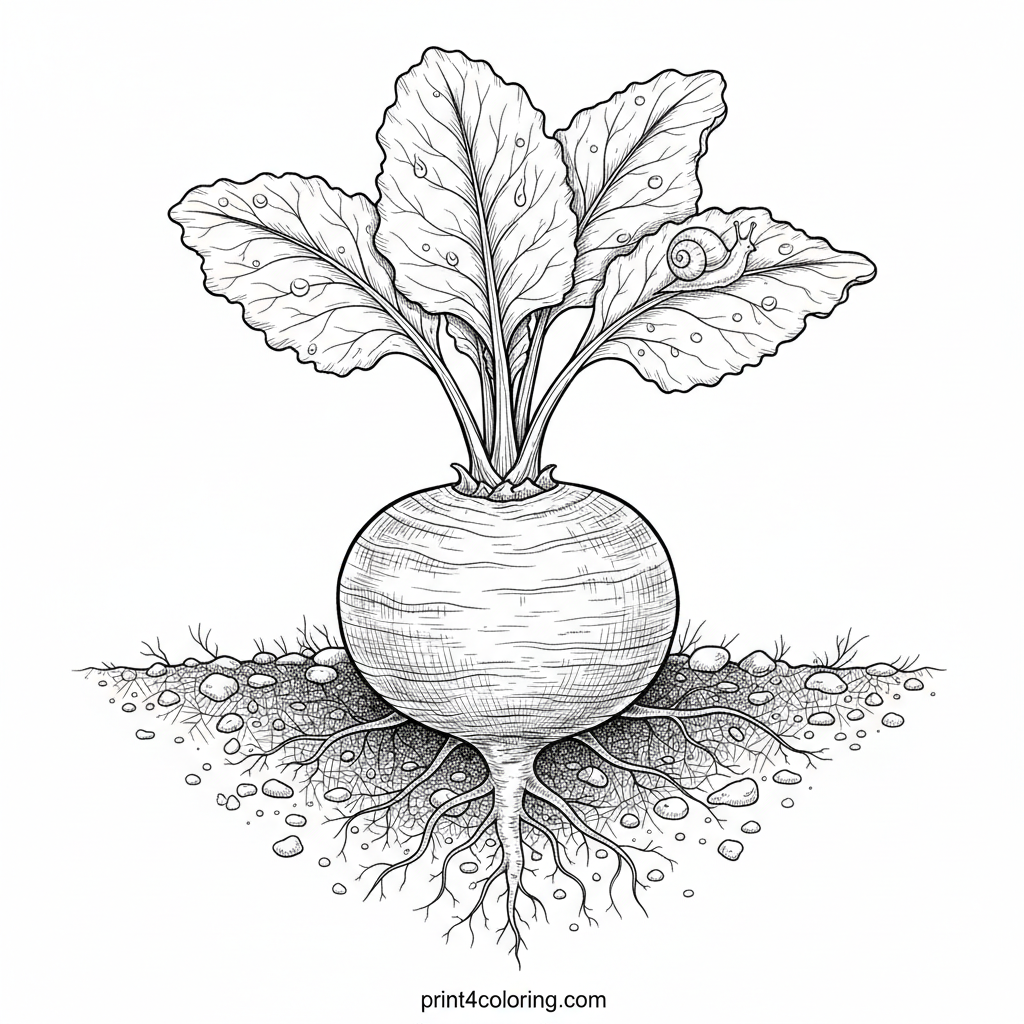 Dive into a tiny world with this detailed coloring page! A plump beet root peeks from its cozy soil bed, its strong roots reaching deep. Vibrant green leaves unfurl, catching sparkling raindrops, while a tiny, adventurous snail slowly journeys across a leaf. Discover the beauty of nature up close!
