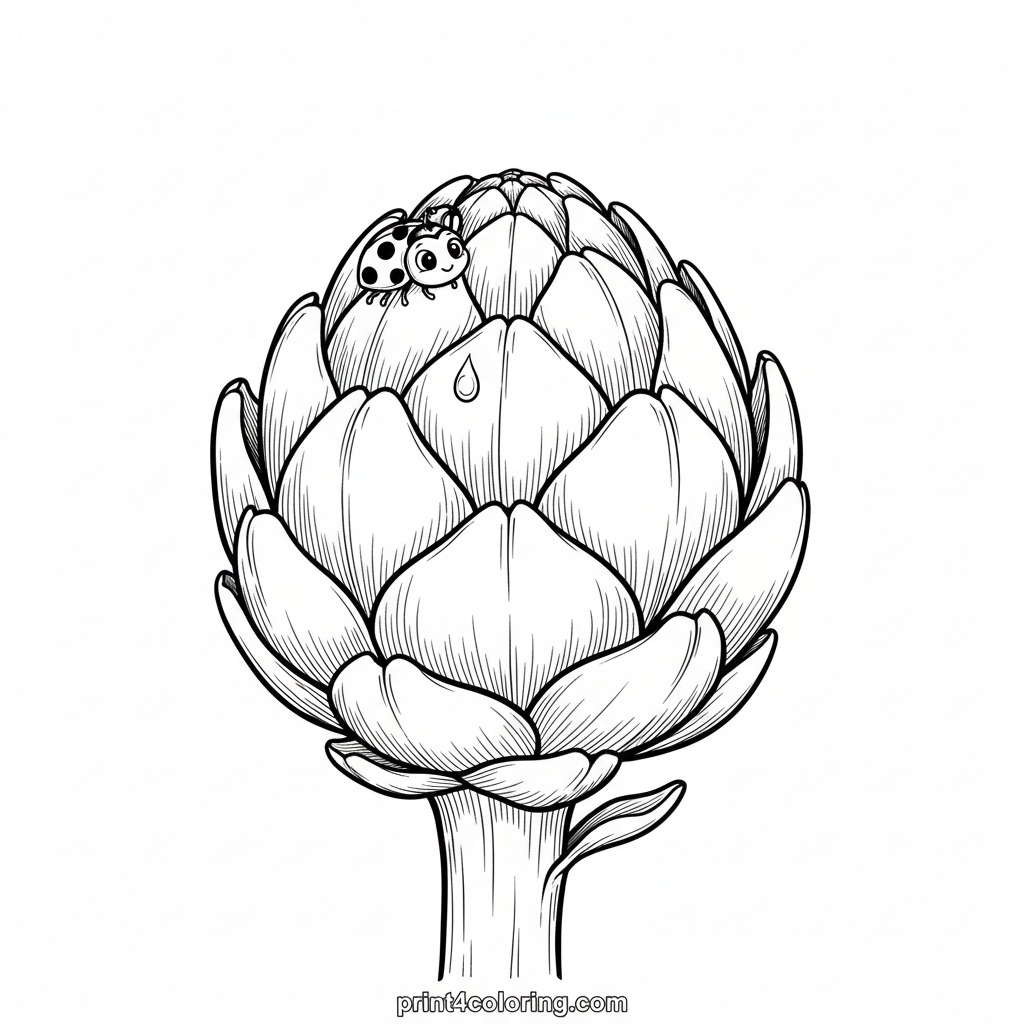 Discover the intricate beauty of nature with this detailed coloring page! A young, unopened artichoke bud shows off its many layered leaves, ready for your artistic touch. A tiny, friendly ladybug explores one smooth leaf, with a sparkling dewdrop nearby. Bring this delightful botanical scene to life with your favorite colors!