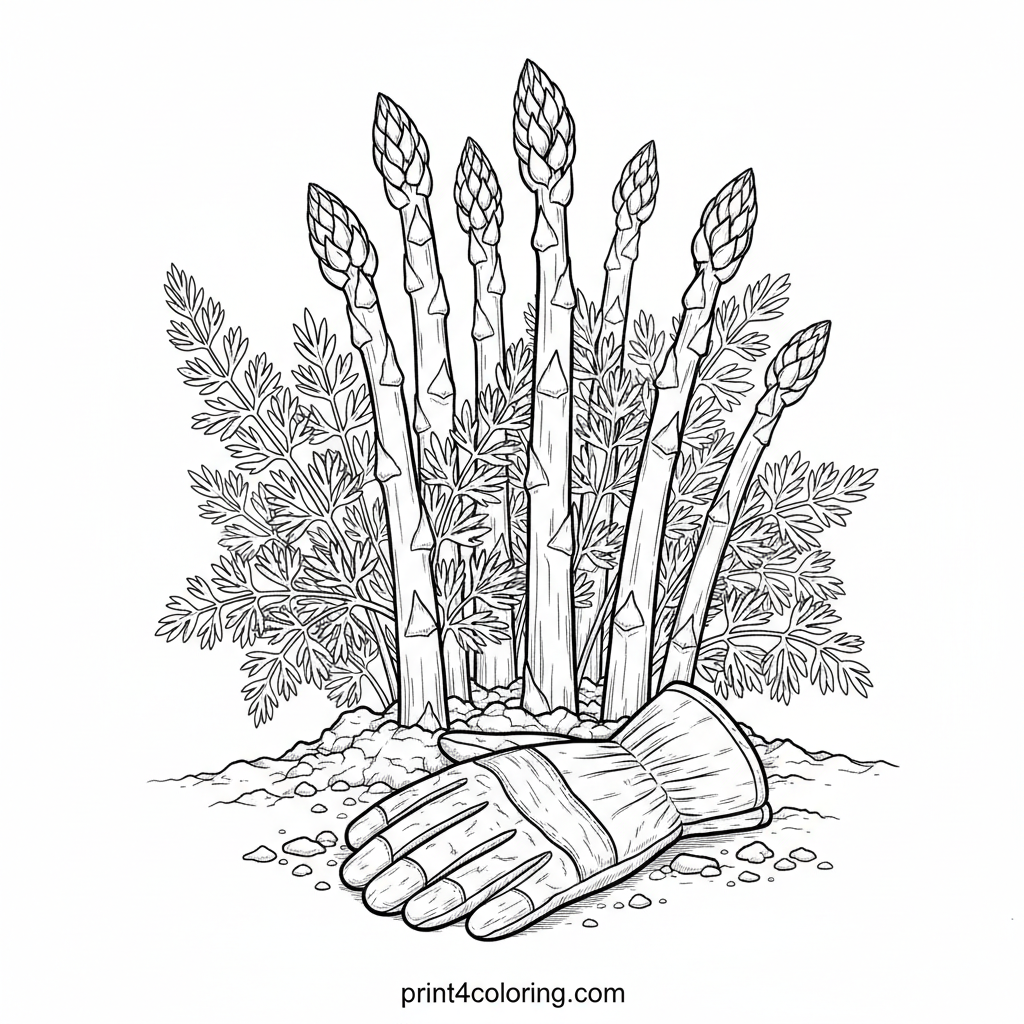 Step into a vibrant garden scene with this detailed asparagus patch! Admire the tall, elegant spears rising from delicate fern-like leaves, surrounded by rich soil textures. A hint of gardening activity, like a watering can or glove, suggests a recent harvest. Perfect for exploring natural textures and greens!