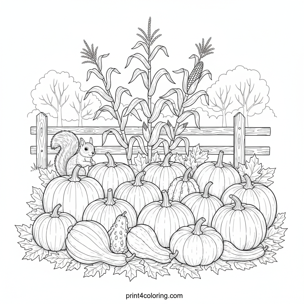 Step into a cozy autumn scene! This detailed coloring page features an abundant display of various pumpkins and gourds, nestled among crisp fallen leaves and tall corn stalks. A curious squirrel peeks from behind a pumpkin, adding a touch of playful charm to this rich harvest tableau. Perfect for detailed coloring.