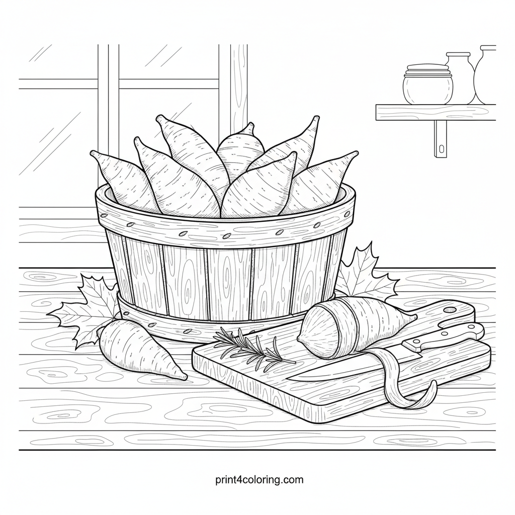 Step into a cozy autumn kitchen scene! This detailed coloring page features a rustic basket overflowing with freshly dug yams, ready for cooking. You'll find a chef's knife and cutting board, with one yam partially peeled. Add vibrant colors to the wooden textures, yams, and subtle autumn leaves or herbs to complete this warm harvest picture.