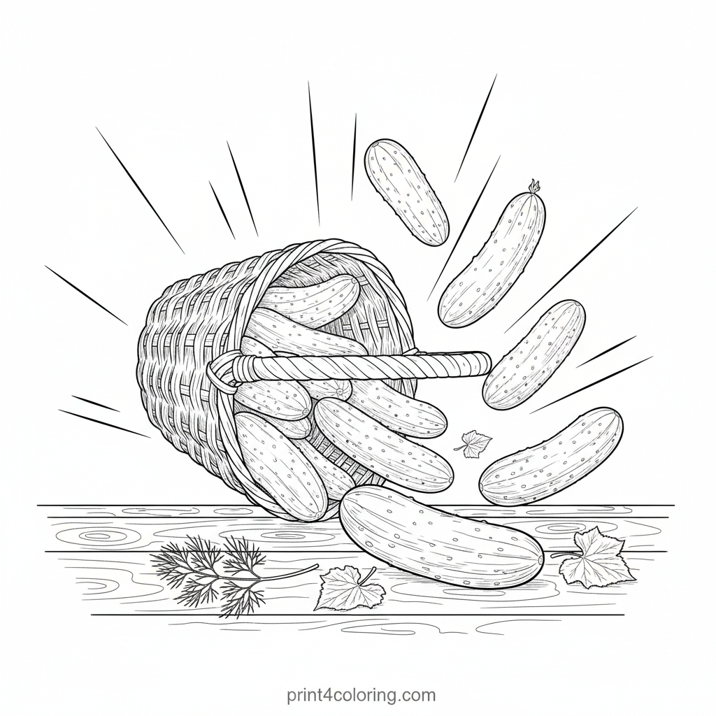 Dive into the joy of a fresh garden harvest! This expert coloring page features a rustic basket overflowing with a delightful variety of cucumbers, each with unique textures. Loose leaves and fragrant dill rest beside it on a wooden surface, inviting you to add vibrant colors to this celebration of nature's bounty.