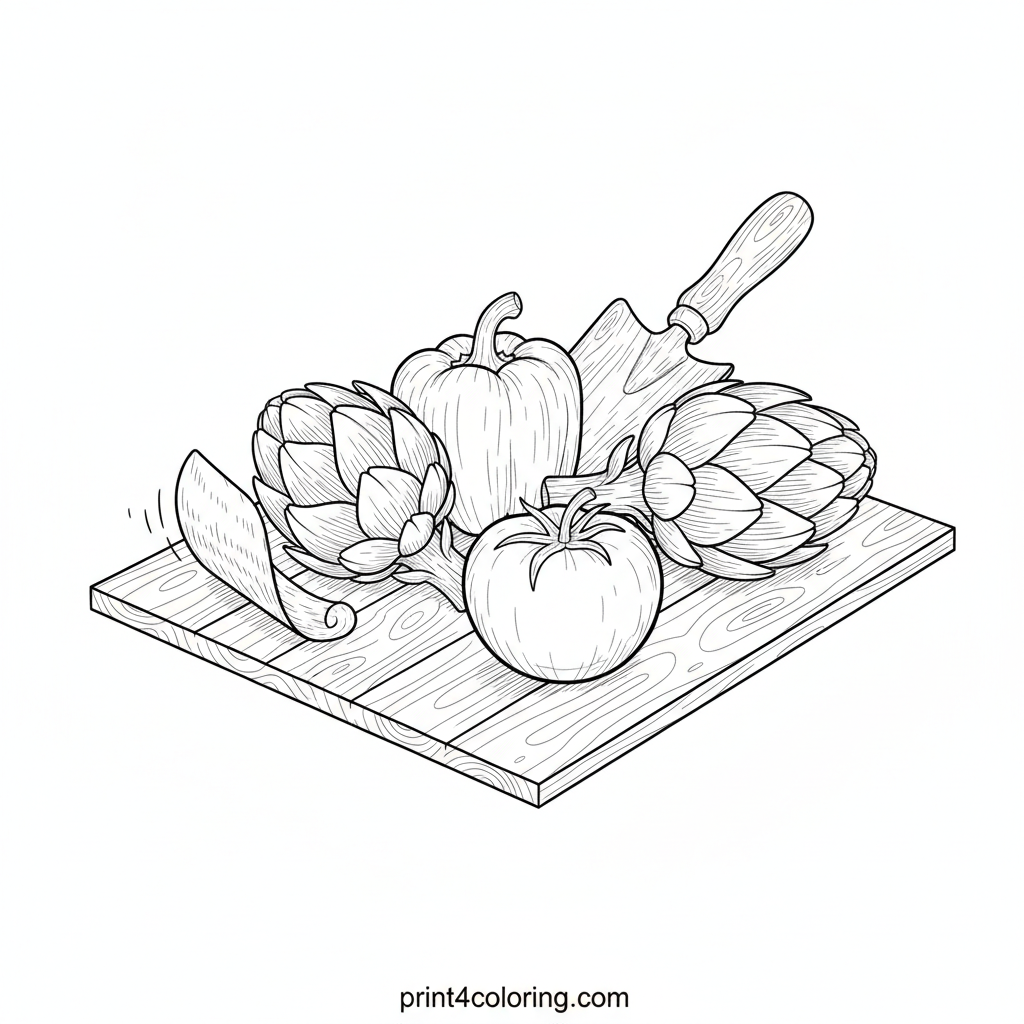 Explore the rich textures of a delightful garden harvest still life! This intricate scene features majestic artichokes, a plump bell pepper, and a juicy tomato, all resting on a rustic wooden table. A vintage trowel adds a touch of garden charm. Perfect for detailed coloring fun!