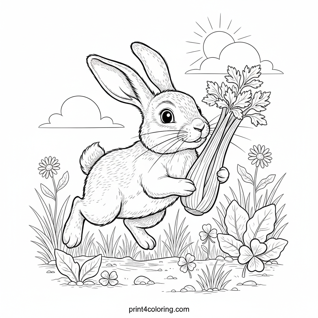 Join a fluffy, realistic bunny as it enjoys a crispy celery snack in a sun-drenched garden. This detailed scene features soft fur, curious whiskers, intricate blades of grass, and delicate wildflowers, inviting you to add vibrant colors to this peaceful moment of nature.