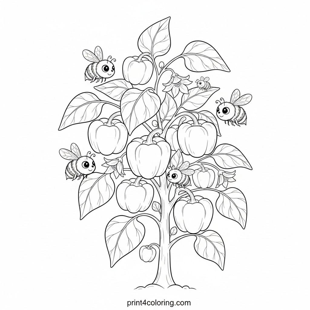 Dive into a vibrant garden scene where diligent honeybees are hard at work! Color a healthy bell pepper plant bursting with red, yellow, and green peppers, surrounded by lush leaves and delicate flowers. Watch the bees buzz and pollinate in this cozy, sunny patch.
