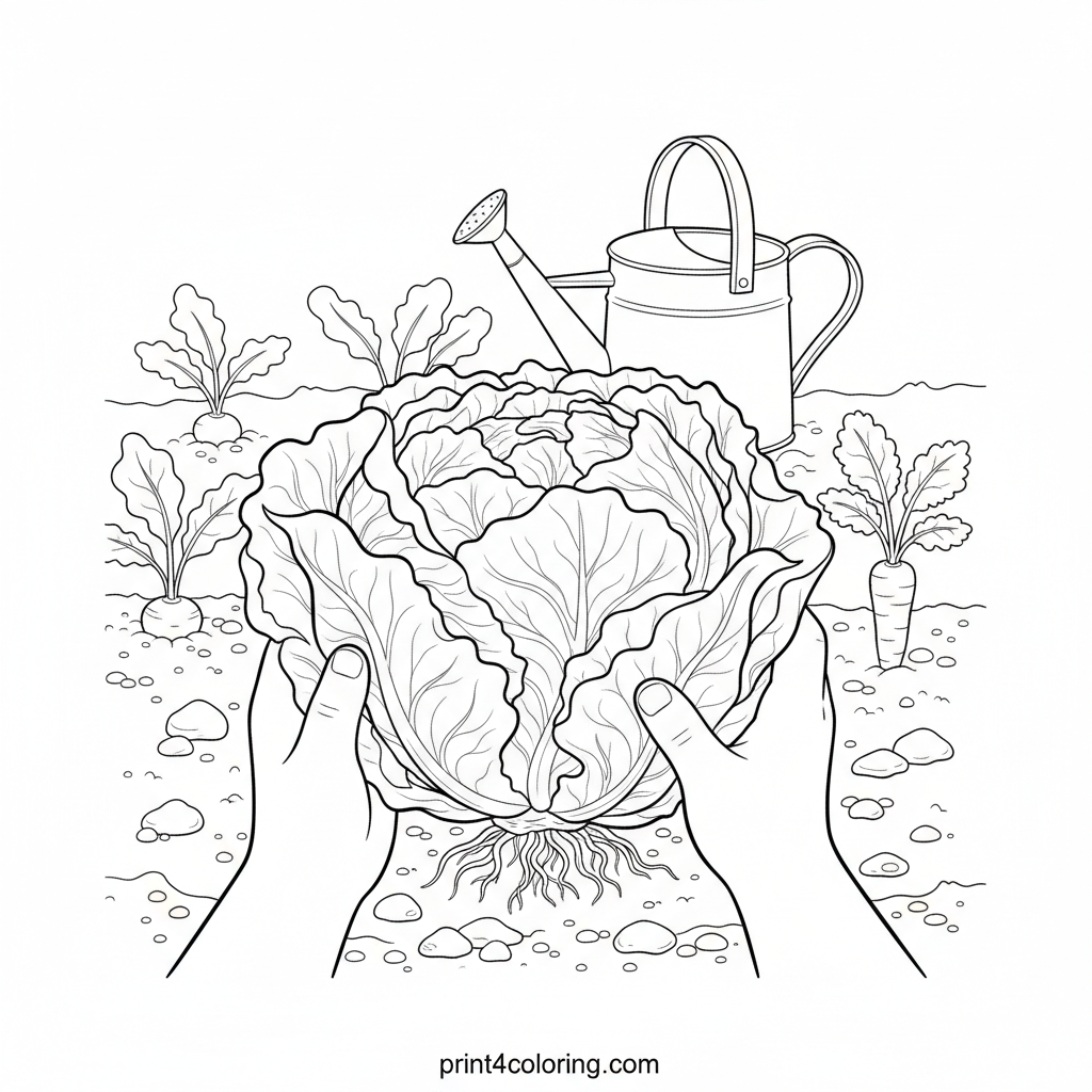 Discover the simple joy of harvest time! This detailed coloring page shows gentle hands carefully pulling a beautiful head of butter lettuce from a rich garden bed. Surround yourself with earthy soil textures, tiny plant friends, and a watering can ready for the next adventure. A perfect scene for nature lovers!