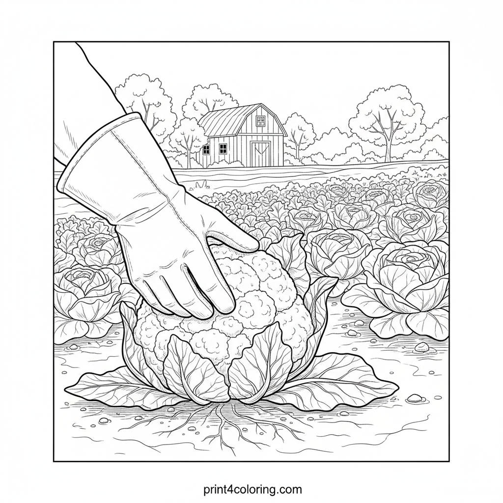 Experience the joy of a garden harvest! A sturdy, gloved hand carefully plucks a magnificent, perfectly formed cauliflower from its rich garden bed. Notice the intricate florets and detailed leaves. In the background, discover more vegetable rows and a charming farm building, ready for your expert coloring skills to bring this bountiful scene to life!