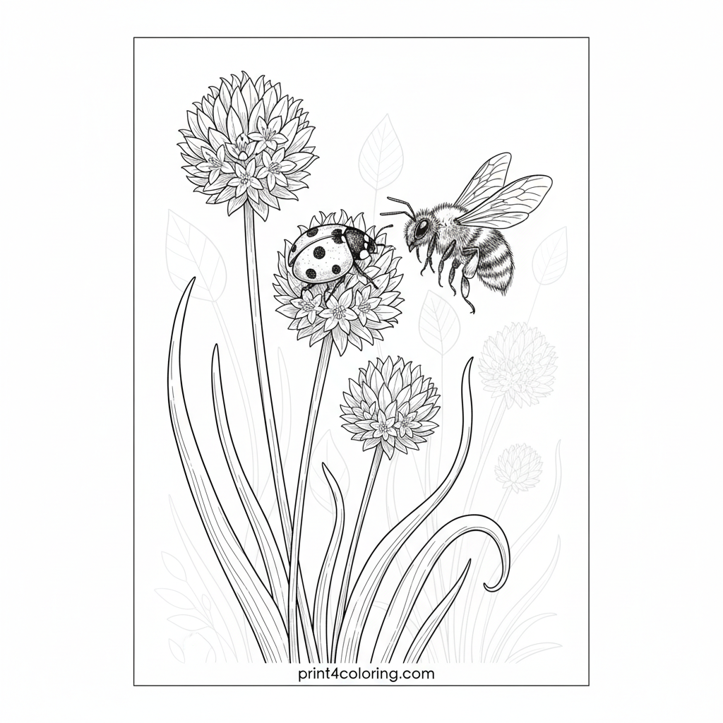Explore the intricate beauty of a garden's tiny treasures! This detailed coloring page features a thriving cluster of chive plants with their slender leaves and spherical purple flowers. A friendly ladybug carefully explores a stalk, while a busy bee hovers near a blossom. Bring this vibrant botanical scene to life!