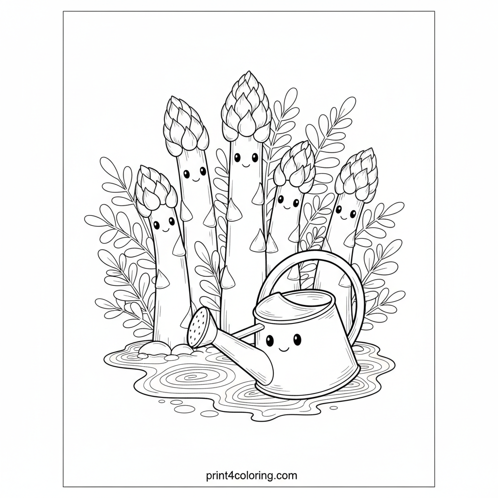 Step into a charming garden scene where a bountiful asparagus patch awaits your artistic touch! Delicate fern-like leaves surround tall, vibrant asparagus spears, ready for harvest. A rustic watering can peeks from the foreground, hinting at the loving care given to this thriving patch. Explore intricate textures and bring this cozy garden to life with your favorite colors.
