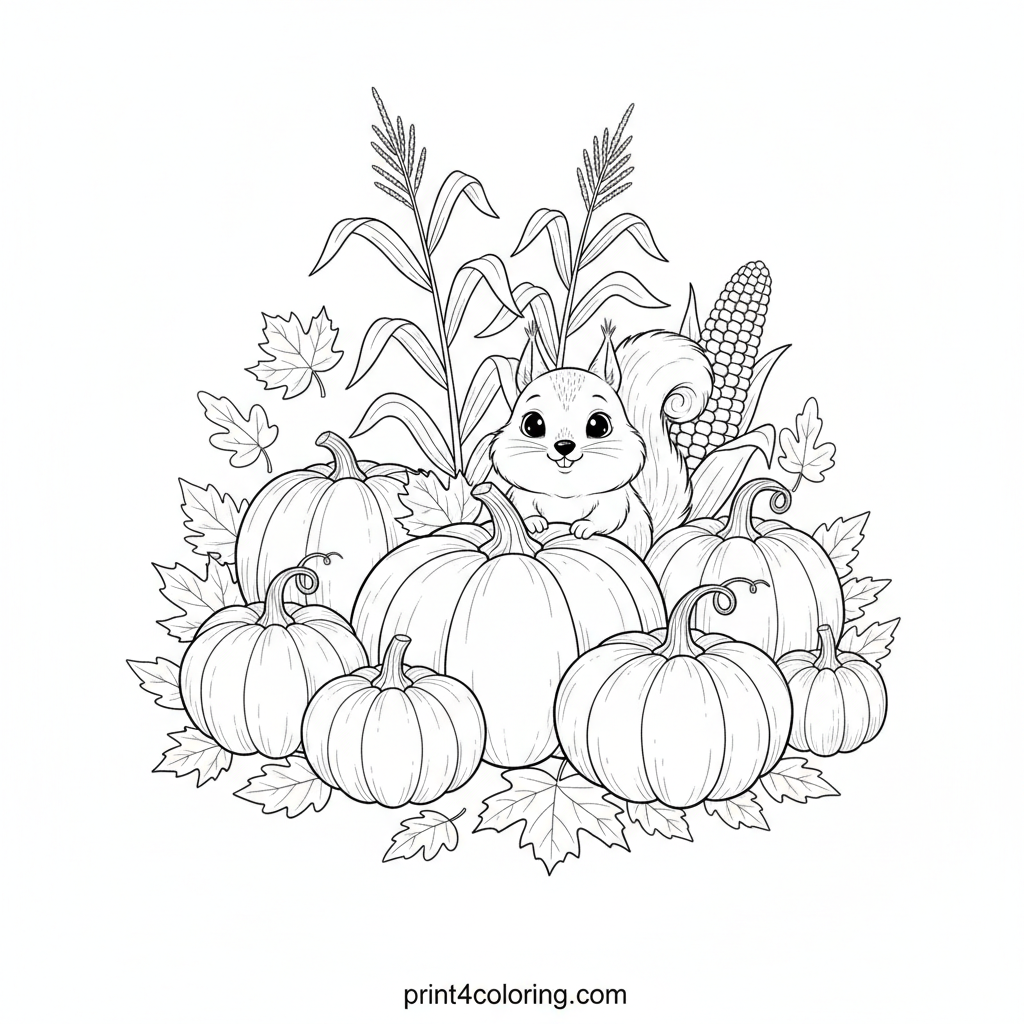 Step into a charming autumn scene brimming with nature's beauty! This detailed coloring page showcases a delightful assortment of pumpkins and gourds, nestled amidst crisp fallen leaves and tall corn stalks. A friendly squirrel peeks out, adding a touch of whimsy to this abundant harvest display. Perfect for a cozy coloring session!