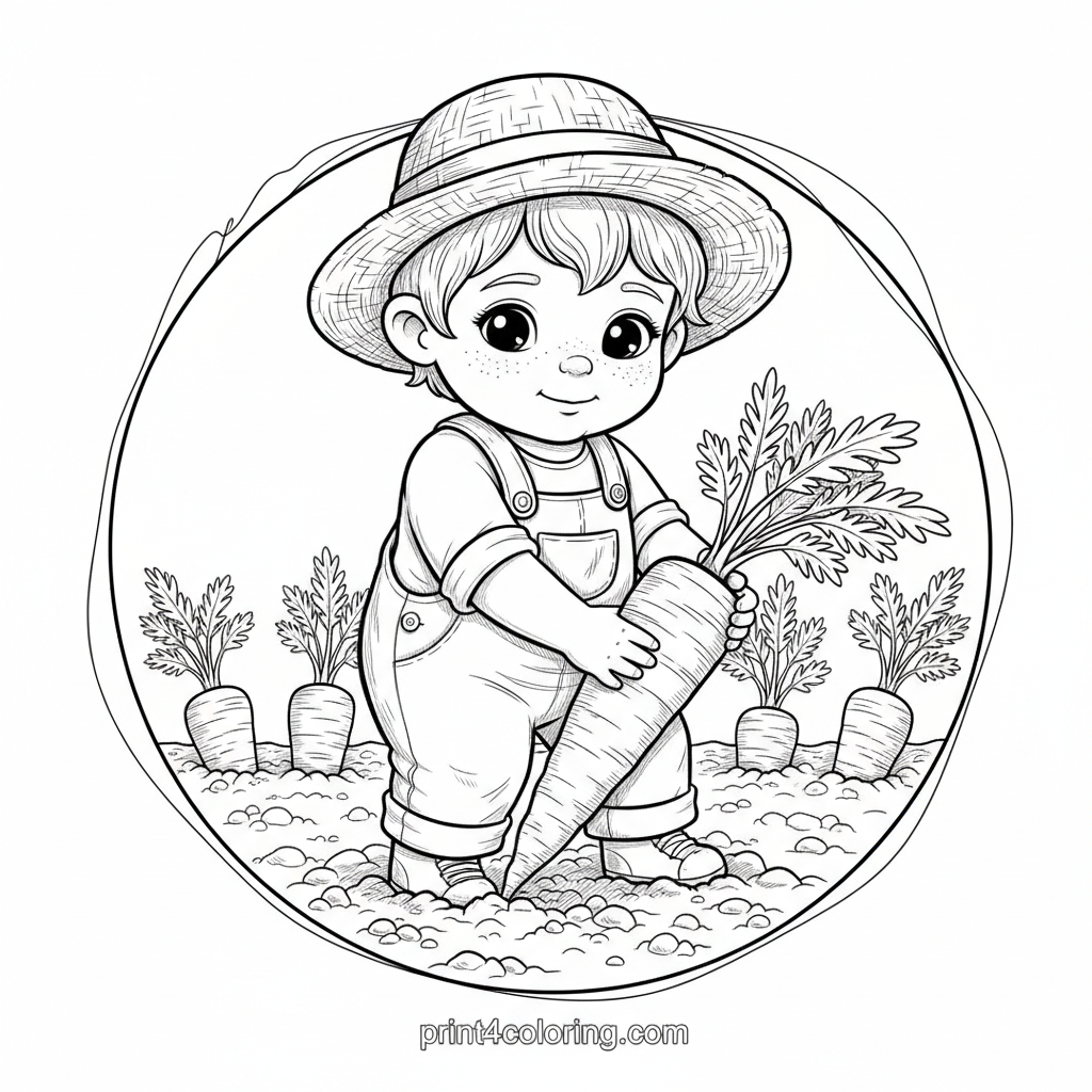 Join a friendly farmer in a sun-drenched garden, carefully pulling a long, detailed carrot from rich, textured soil. Dressed in overalls and a straw hat, they celebrate nature's bounty. Other carrots peek from the ground, inviting you to add vibrant colors to this cozy harvest scene.