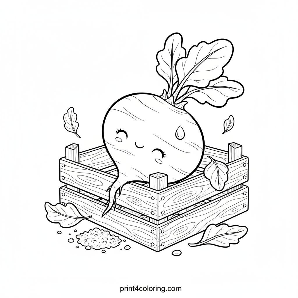 Discover the beauty of nature's bounty with this detailed coloring page. A freshly harvested beet root, still adorned with a touch of soil, rests gently on a rustic wooden crate. Delicate fallen leaves and a glistening drop of morning dew complete this charming, realistic autumn scene, perfect for a cozy coloring adventure.