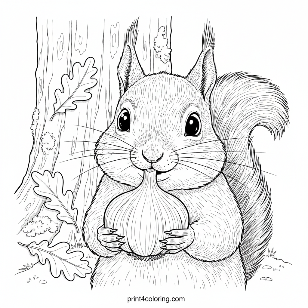 Discover a delightful forest scene! A friendly, bushy-tailed squirrel gently sniffs a large, intriguing garlic bulb it found at an ancient oak's base. The detailed forest floor, with fallen leaves and soft moss, awaits your artistic touch. Bring this curious encounter to vibrant life!
