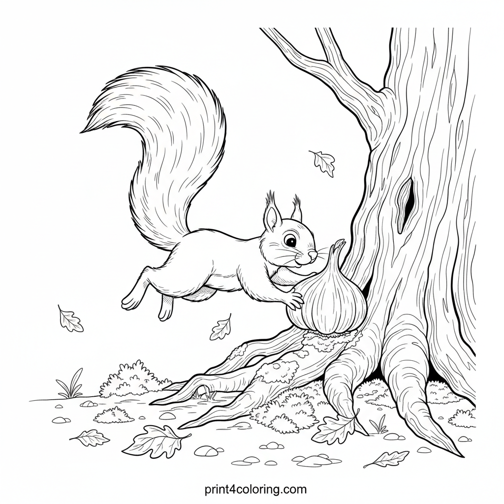Join a friendly squirrel on an amazing forest adventure! This detailed page shows our bushy-tailed friend gently sniffing a mysterious, round garlic bulb found at the base of an ancient oak tree. Explore a vibrant forest floor, complete with intricate leaves and soft moss, ready for your artistic touch.