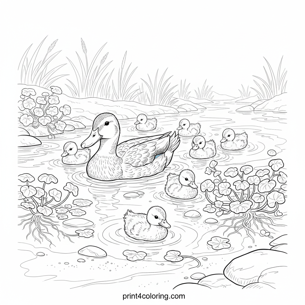 Ducklings' Serene Watercress Stream Adventure Coloring Page