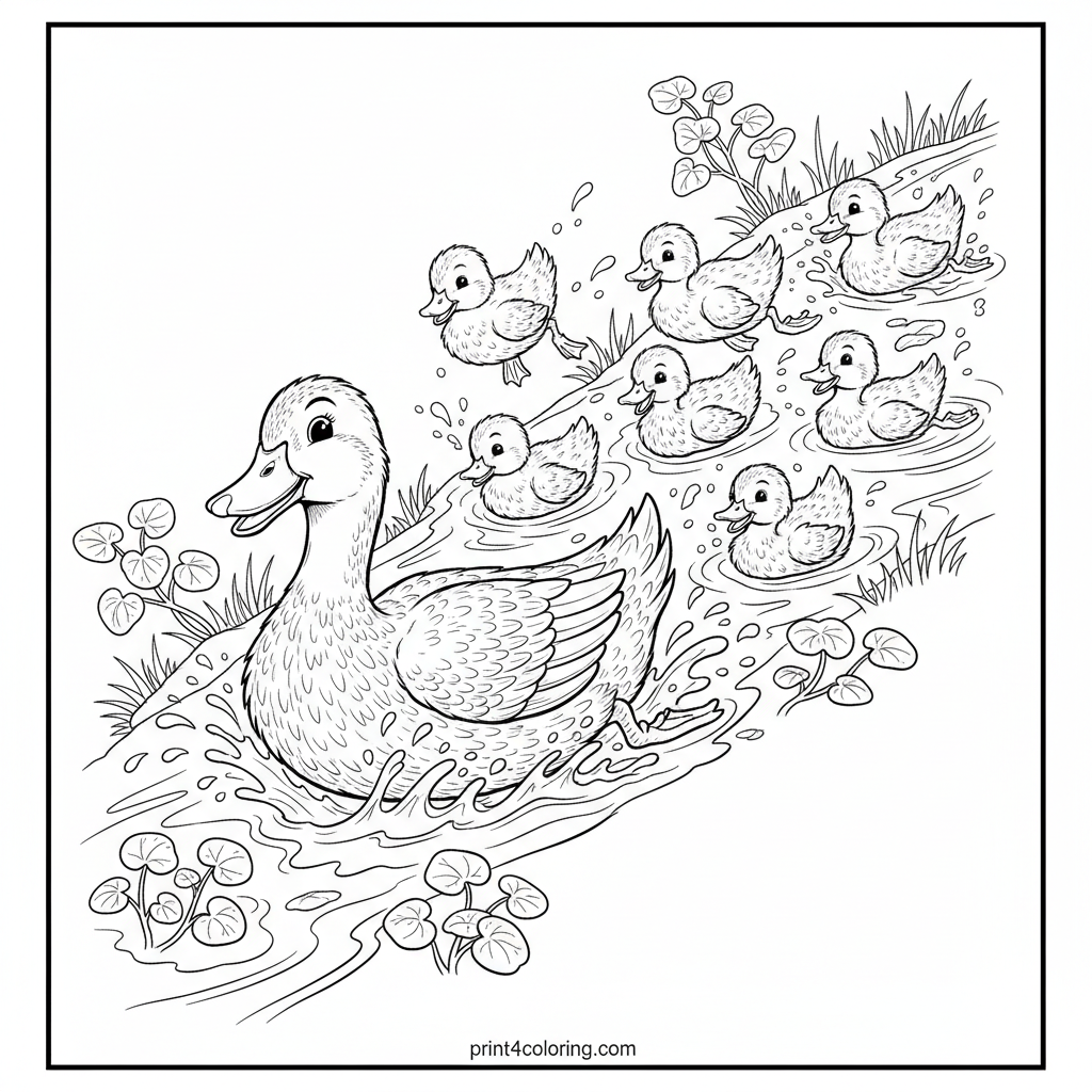 Dive into a delightful scene where fluffy ducklings embark on a watercress adventure! Watch as they gracefully swim through a clear stream, led by their watchful mother. Explore the intricate details of lush watercress growing all around, inviting you to add vibrant colors to this playful family exploration.