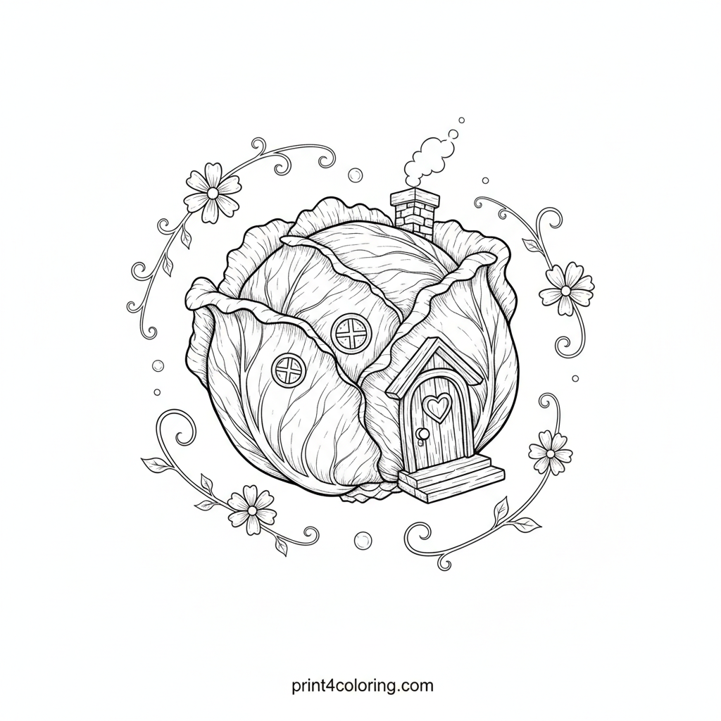 Step into a magical garden where a tiny, adorable cottage makes its cozy home inside a giant, plump cabbage! Discover intricate details like a little chimney, wooden door, and windows, all nestled among the cabbage's protective leaves. Whimsical wildflowers surround this charming scene, inviting your expert coloring touch!