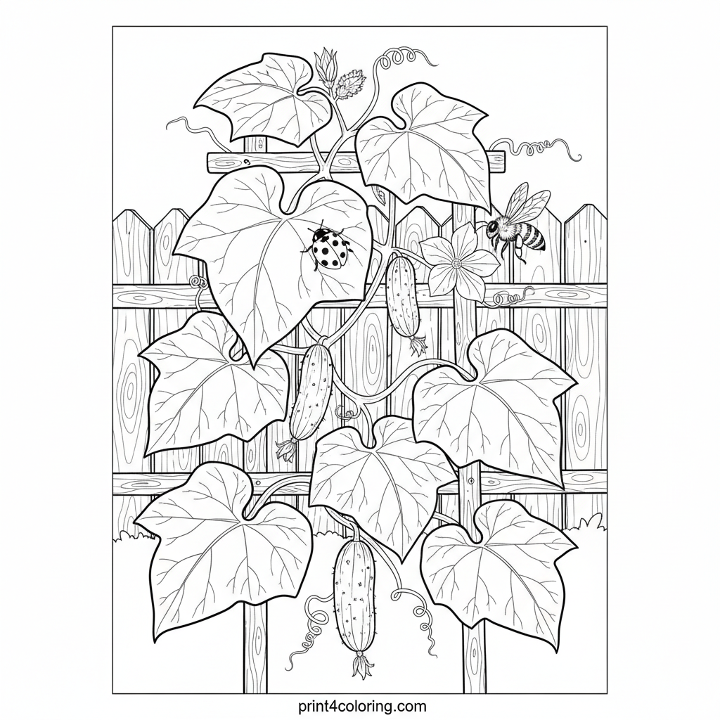 Dive into a vibrant garden scene! This expert-level page showcases a detailed cucumber vine with broad leaves, delicate tendrils, and ripening cucumbers. Spot a friendly ladybug on a leaf and a busy honeybee near a flower, all framed by a rustic garden fence. A truly immersive nature experience!